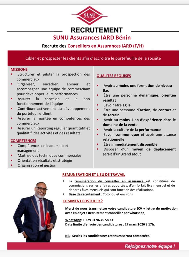SUNU Assurances IARD Bénin Recrute des Conseillers en Assurances IARD (F/H)